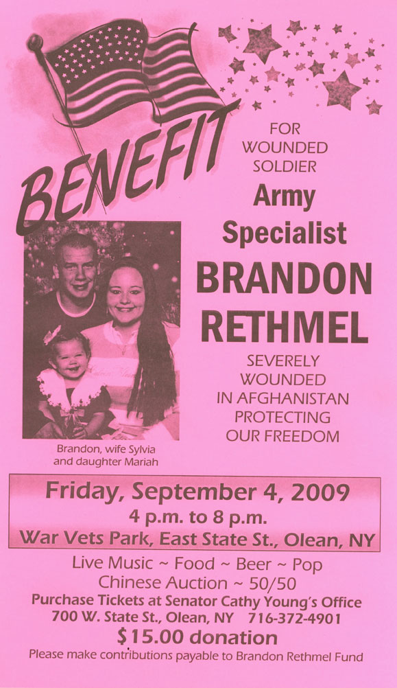 There will be a benefit for wounded soldier Army Specialist Brandon Rethmel who was severely wounded in Afghanistan on September 4 from 4-8 PM at War Vets Park, East State Street, Olean, NY