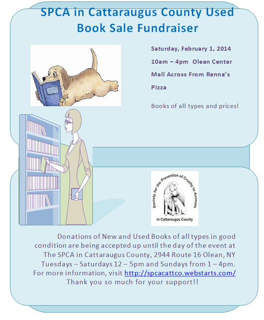 Winter is the perfect time to curl up with a good book and on February 1st, there will be a way to satisfy your love of reading and help homeless animals at the same time!The Cattaraugus County SPCA has announced that they will be holding a used book sale fundraiser, Saturday, February 1, from 10am until 4pm at the Olean Center Mall in the space across from Renna's Pizza.
