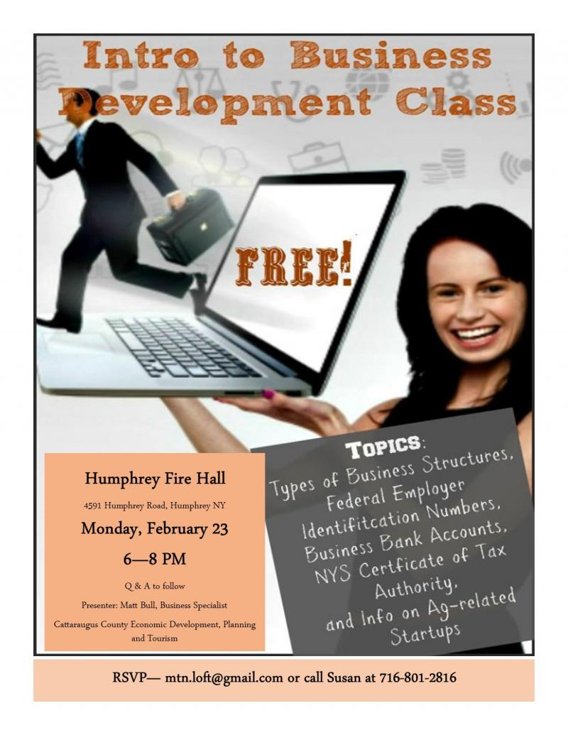 Free class on Introduction to Business Development on Monday, February 23, 2015 from 6-8PM at the Humphrey Fire Hall.