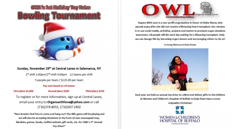 OWL's Annual Holiday Toy Drive on Sunday, November 29th at Central Lanes in Salamanca, NY.