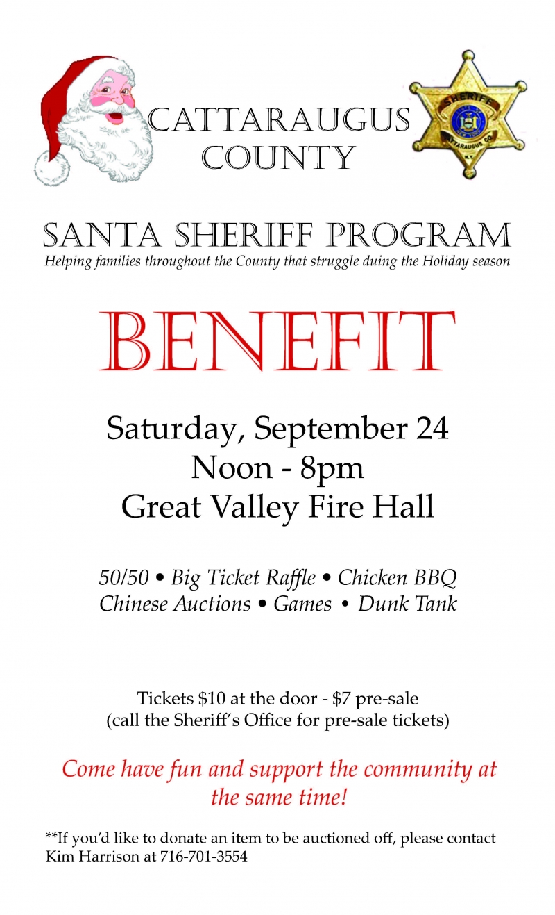 Cattaraugus County Santa Sheriff Benefit Please note that this event has expired! Date(s): Sat, 09/24/2016 - 12:00pm Javascript is required to view this map. Dept./Office: Sheriff's Office Filed under: