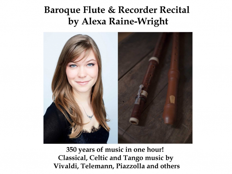 Baroque Flute & Recorder Recital by Alexa Raine-Wright. 350 years of music in one hour! Classical, Celtic and Tango music by Vivaldi, Telemann, Piazzolla and others