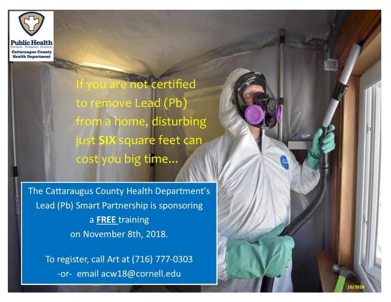 The Cattaraugus County Health Department's Lead (Pb) Smart Partnership is sponsoring a FREE Lead Renovator Training in Ellicottville. The Lead Renovator program is a FREE 8 hour course that focuses on removing lead (PB) from a home safely. The training is for homeowners, contractors and their employees, building trades, or those who would like to use the certification to obtain work in construction. These trainings are not offered widely in our community, and usually cost $150 or more!! Take advantage of this FREE training while it's available locally.