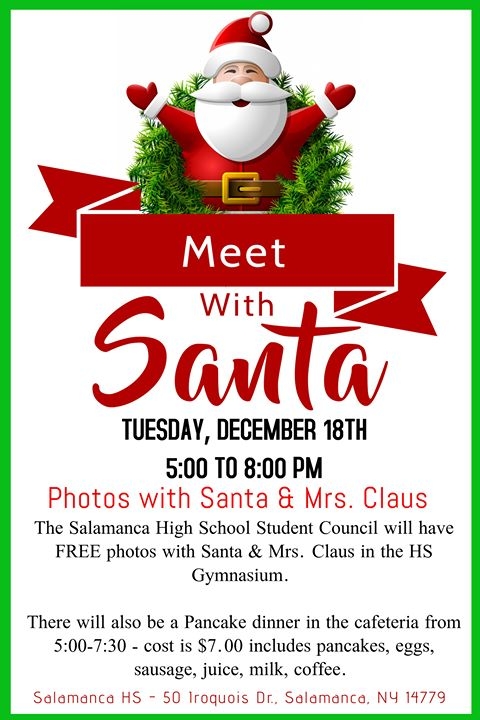 Everyone's favorite guy is coming to Salamanca High School. Meet with Santa and the Mrs. and even get a FREE photo! Hosted by Salamanca High School Student Council and held in the HS Gymnasium, there is also a Pancake dinner in the cafeteria from 5-7:30pm in the cafeteria. Cost for the dinner is $7 and include pancakes, eggs, sausage, juice, milk, and coffee.
