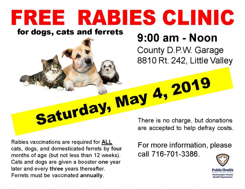 There will be a rabies clinic held at the Cattaraugus County Department of Public Works garage in Little Valley on May 4th from 9:00 am to Noon.