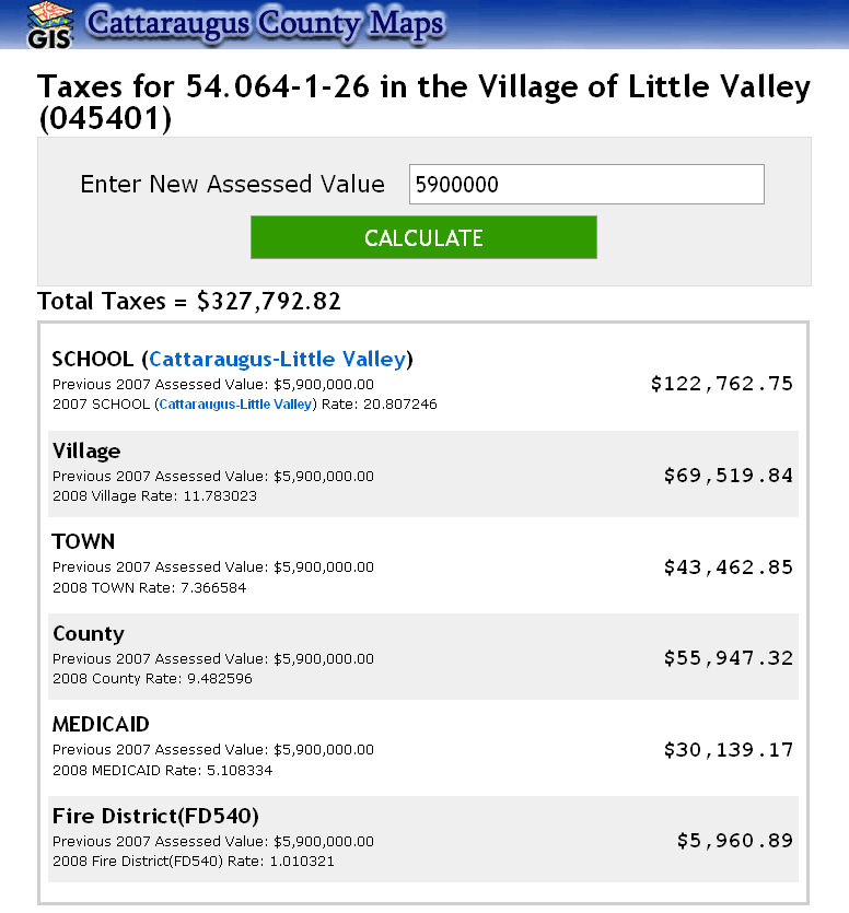 This can be tested by looking at the Tax Tool report for the Cattaraugus County Center in Little Valley. The tool itself is found on the mapping portion of the Parcel Viewer and is used by clicking on the tool, then clicking on any parcel (you must check on either of the Parcel layers and have the Parcel Layer active).