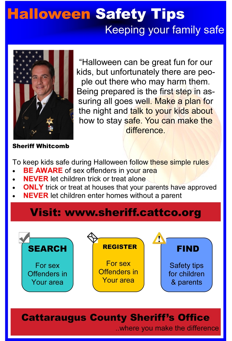 "Halloween can be great fun for our kids, but unfortunately there are people out there who may harm them. Being prepared is the first step in assuring all goes well. Make a plan for the night and talk to your kids about how to stay safe. You can make the difference." - Sheriff Whitcomb