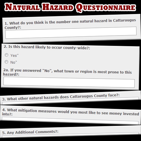 Cattaraugus County continues to seek public comments on its Multi-Jurisdictional Hazard Mitigation Plan. A web form questionnaire for the public is available online through the County's website at http://www.cattco.com/form/hazard-mitigation-plan-few-questions. The five-question survey is easy to complete and will assist the County in completing its mandatory five-year update of its existing plan.