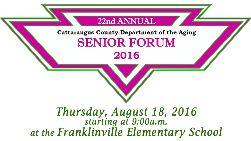 Cathy Mackay, director of the Cattaraugus County Department of the Aging/NY Connects, has announced that the agency's Twenty-Second (22nd) Annual Senior Forum and Public Hearing will be held Thursday, August 18, 2016, at the Franklinville Elementary School beginning at 9:00 a.m. The forum is open to all persons age 60 and older who are residents of Cattaraugus County.