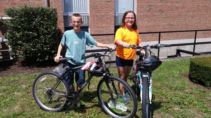 Two area youth are the proud recipients of new mountain bikes, courtesy of the Cattaraugus County Sheriff's Employees Benevolent Association. Every year at the Cattaraugus County Fair in Little Valley, boys and girls are eligible to enter a drawing for one boy's bicycle and one girl's bicycle. This year's winners are, from left to right, Mathurin Griffith of Randolph and Tara Lovern of Little Valley. Each youth also received a bicycle safety helmet donated by Walmart.