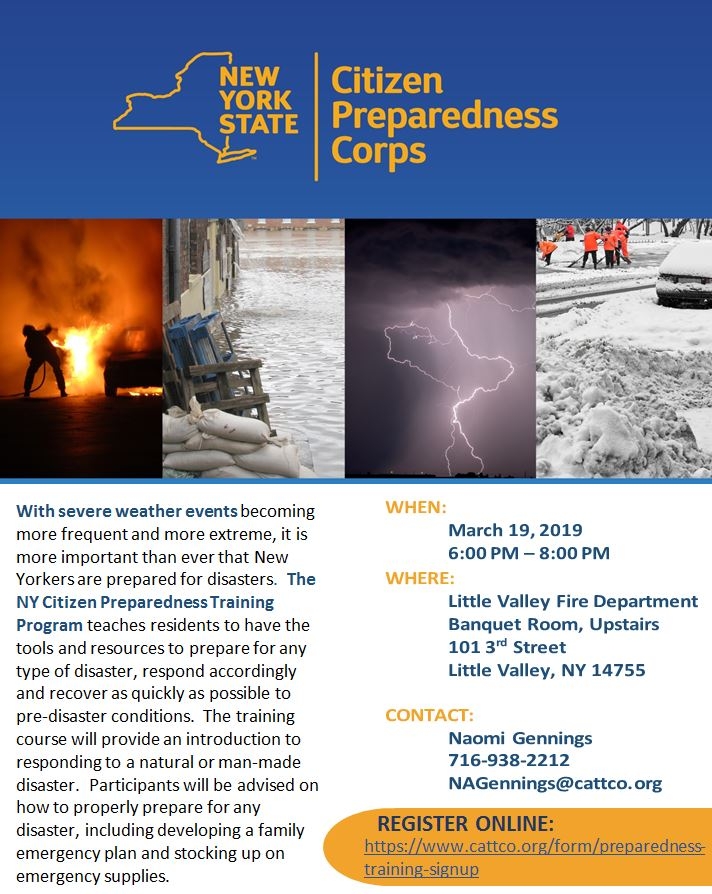 With severe weather events becoming more frequent and more extreme, it is more important than ever that New Yorkers are prepared for disasters. The NY Citizen Preparedness Training Program teaches residents to have the tools and resources to prepare for any type of disaster, respond accordingly and recover as quickly as possible to pre-disaster conditions. The training course will provide an introduction to responding to a natural or man-made disaster. Participants will be advised on how to properly prepare for any disaster, including developing a family emergency plan and stocking up on emergency supplies.