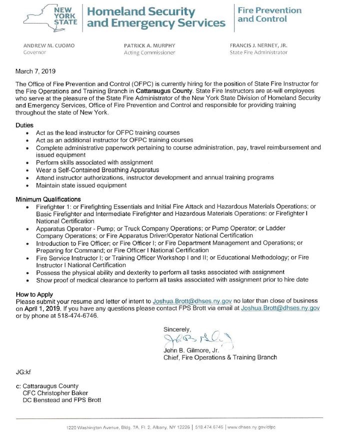 Attached below for download is a canvass letter from New York State (NYS) Office of Fire Prevention and Control (OFPC), a division of the NYS Department of Homeland Security and Emergency Services (DHSES), with details outlining the application process for State Fire Instructor assigned to Cattaraugus County.  We currently have 2 openings and are looking forward to filling them with qualified individuals as soon as possible.  Resume and letter of intent must be sent to FPS Joshua Brott at Joshua [dot] Brott [at] dhses [dot] ny [dot] gov by April 1, 2019.